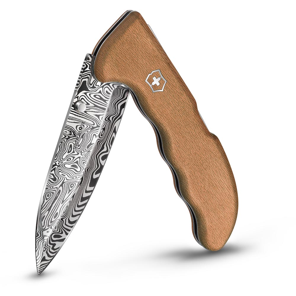 Die Evoke Wood Damast Limited Edition 2026 vereint moderne Funktionalität mit traditioneller Schmiedekunst und richtet sich an Anwender mit Anspruch sowie an Sammler besonderer Stücke. Im Mittelpunkt steht die grosse Klinge aus 115-lagigem Damasteel®, deren charakteristisches Gysinge-Muster jedes Messer zu einem Unikat macht. Die Kombination aus Härte, Schnitthaltigkeit und präziser Verarbeitung steht für die verlässliche Qualität, die man von Victorinox erwartet.